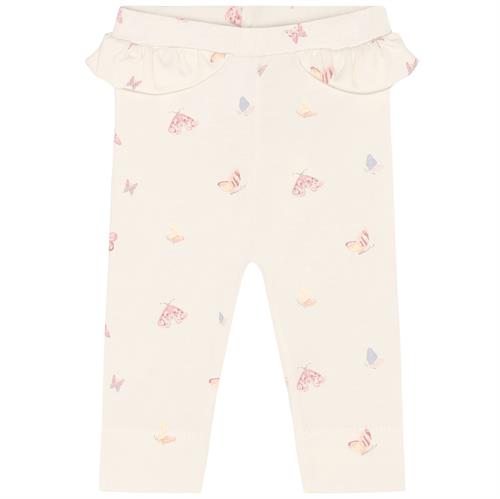 Bukser/leggings, råhvid med rosa sommerfugle. Elastik i linningen og flæsekant.
