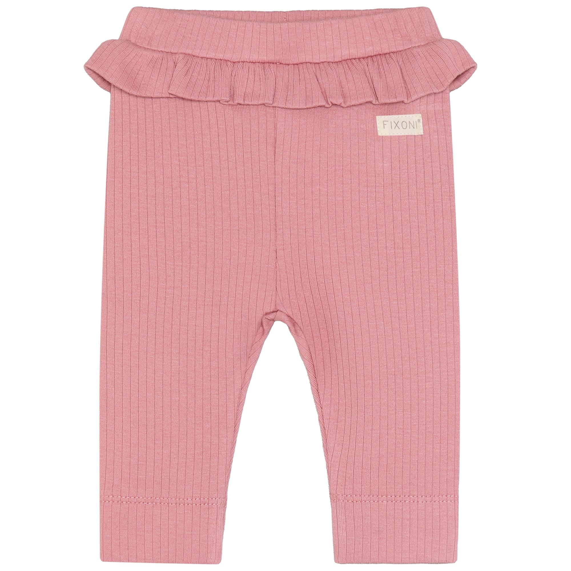 Bukser/leggings i meget blødt modal/bomulds rib. Mørkrosa med flæsekant ved linningen.