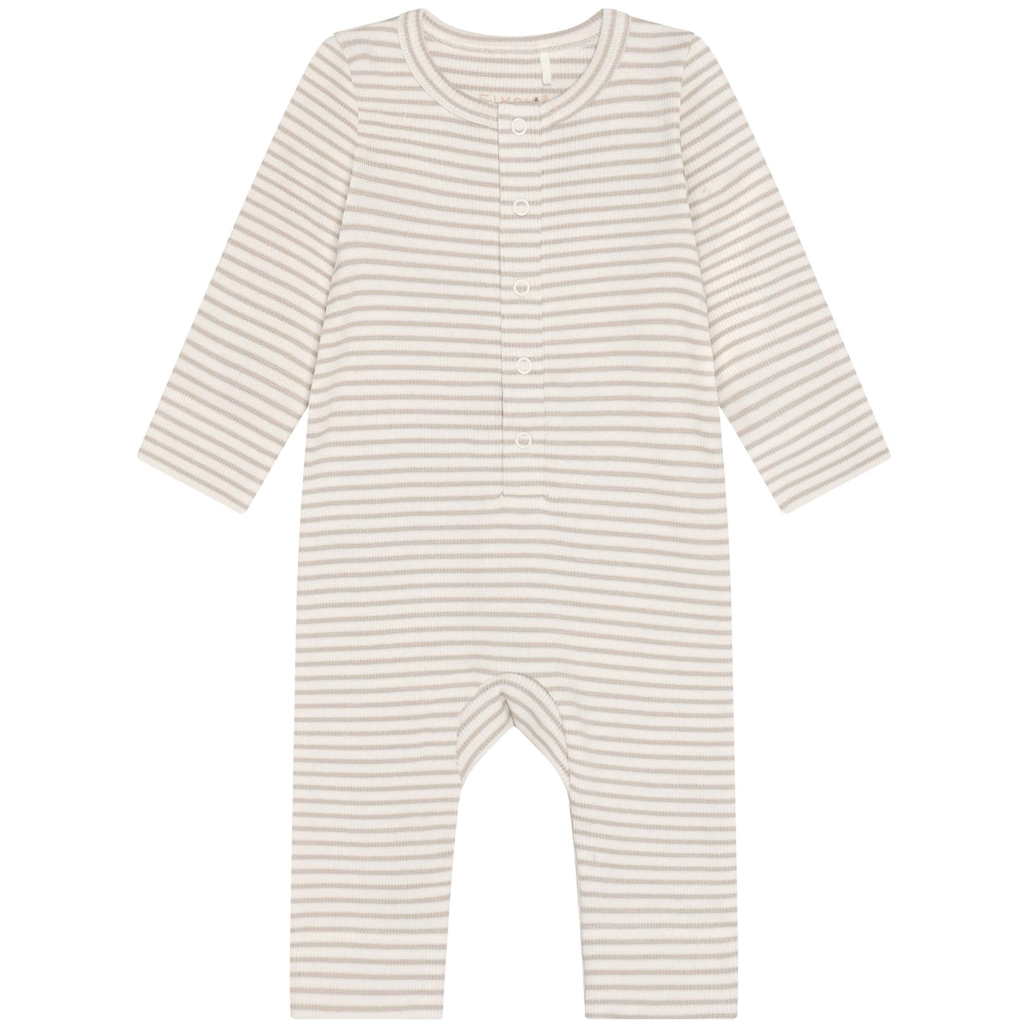 Meget blød heldragt økologisk/GOTS rib med stolpelukning ned foran med trykknapper. Stribet råhvid og beige