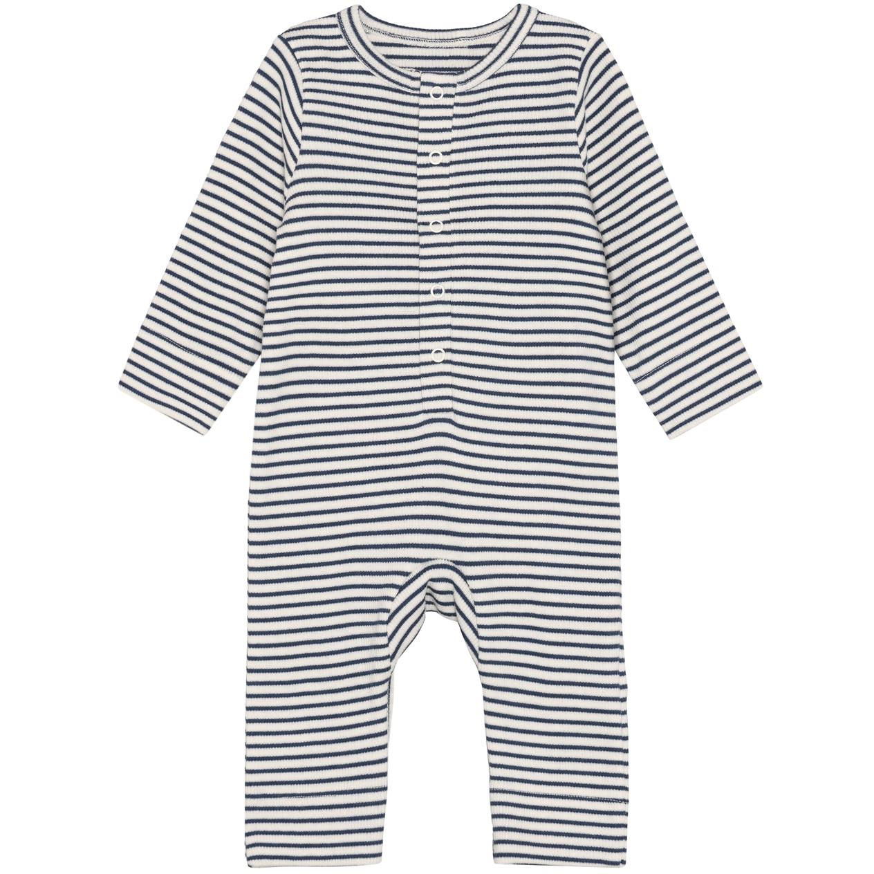 Meget blød heldragt økologisk/GOTS rib med stolpelukning ned foran med trykknapper. Stribet råhvid og marine
