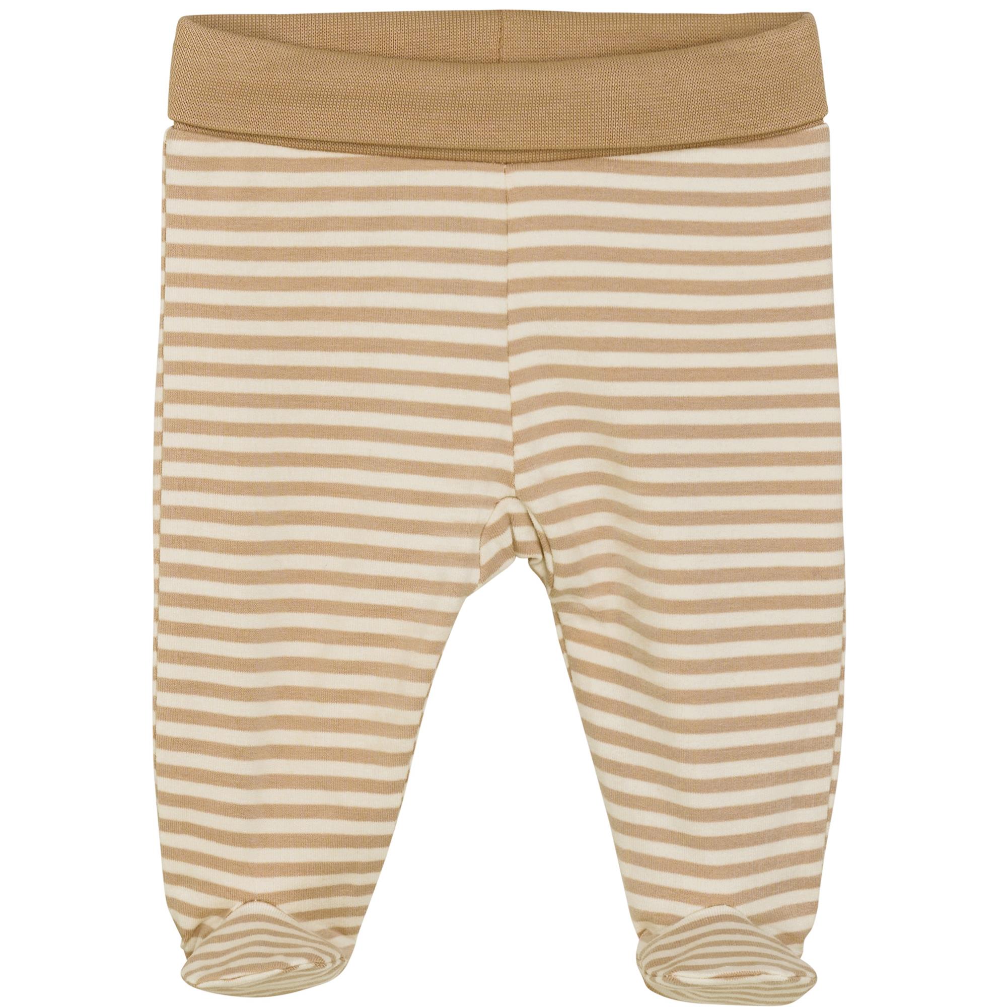 Bukser med fødder i meget blødt bomuld. Ombukket ribkant i taljen. Stribet brun