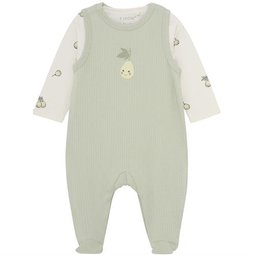 Sparkedragt med fødder i meget blød lysegrøn rib modal/bomuld. En pærer med ansigt, en trykknap på hver skulder, samt trykknapper i bensømmen. Langærmet body beige med pærer. To trykknapper på hver skulder.