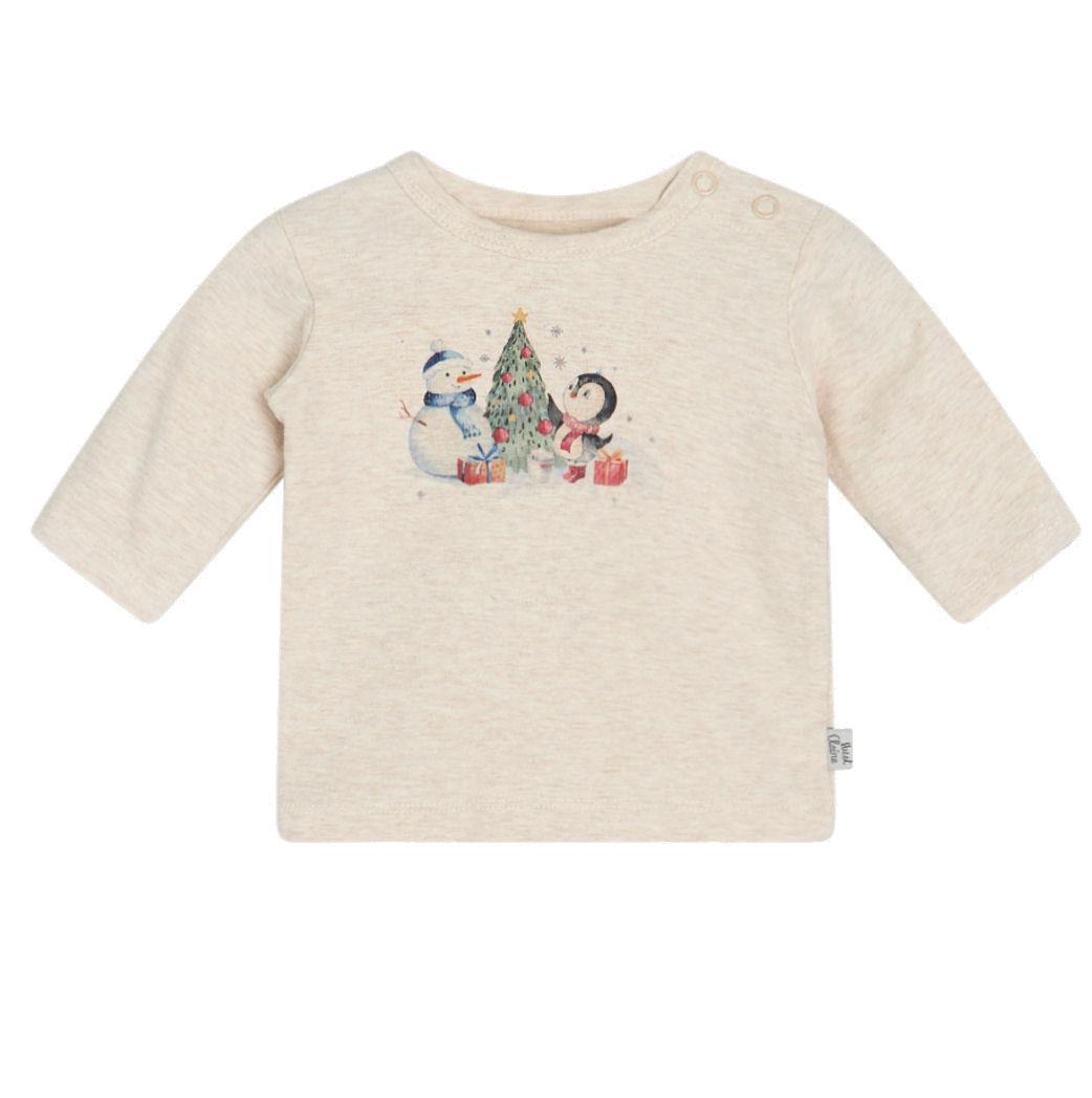 Langærmet t-shirt, lys beige meleret med juletræ, gaver, snemand og pingvin.To trykknapper på hver skulder
