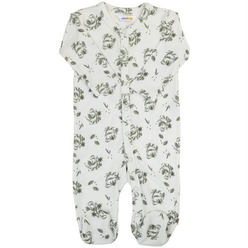 Heldragt med fødder i 100% bambus (viskose), mingrøn med dino. Trykknapper ned foran så den er let at få på.