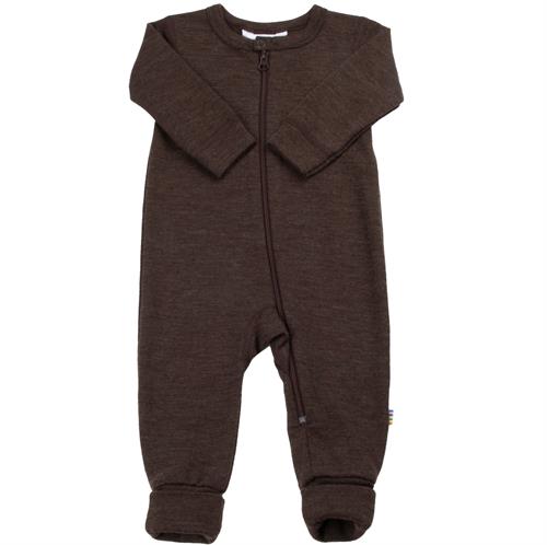 Lækker heldragt i 100% meget blødt uld. Tynd og lækker, mørke brun. Tryllefødder med ekstra stykke der kan bukkes om fødderne. Lynlås foran fra hals til ben, så den er nem at få på.