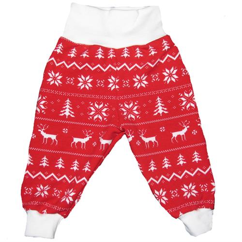 Bløde bukser med bred ribkant i linning og i benkanterne. Rød isoli (blød bagside) med hvidt print og hvid rib. Unik Kids egen produktion