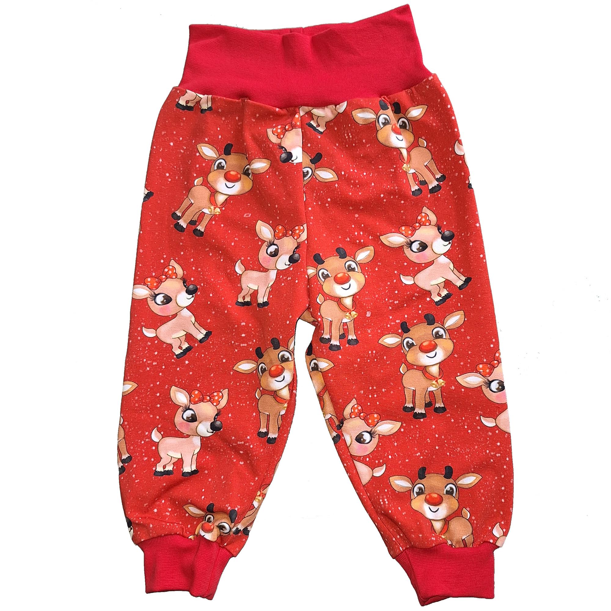 Bløde bukser med bred ribkant i linning og i benkanterne. Rød jersey med Rudolf print, og rød ribkanter.