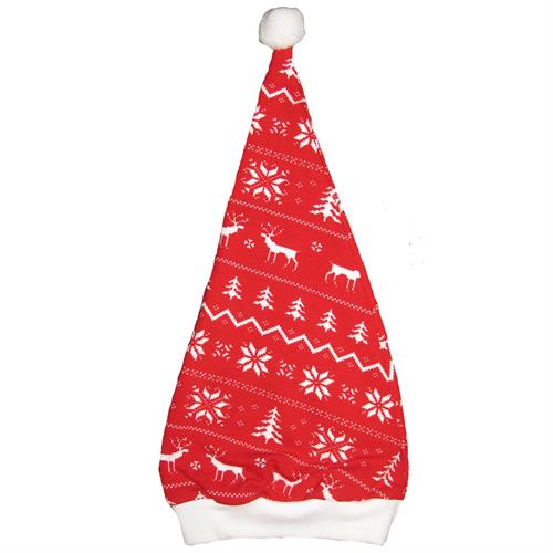 Blød nissehue i rød isoli (blød bagside) med hvidt jule print og hvid rib