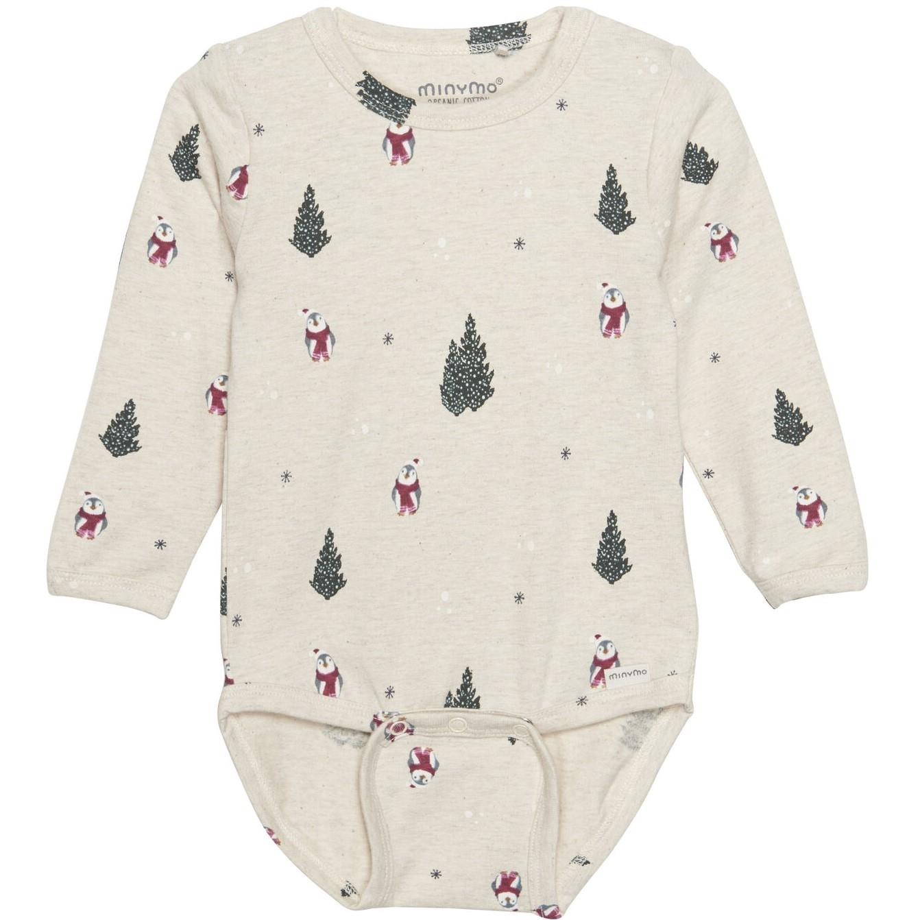 Langærmet body i blød bomuld. Beige meleret med grantræer og pingviner.. To trykknapper på hver skulder.