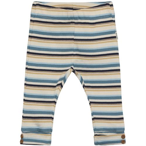 Bukser - leggings i blød økologisk/GOTS rib, stribet råhvid, blå og brun. Bred elastik i taljen og 2 pynteknapper forneden på hver ben.